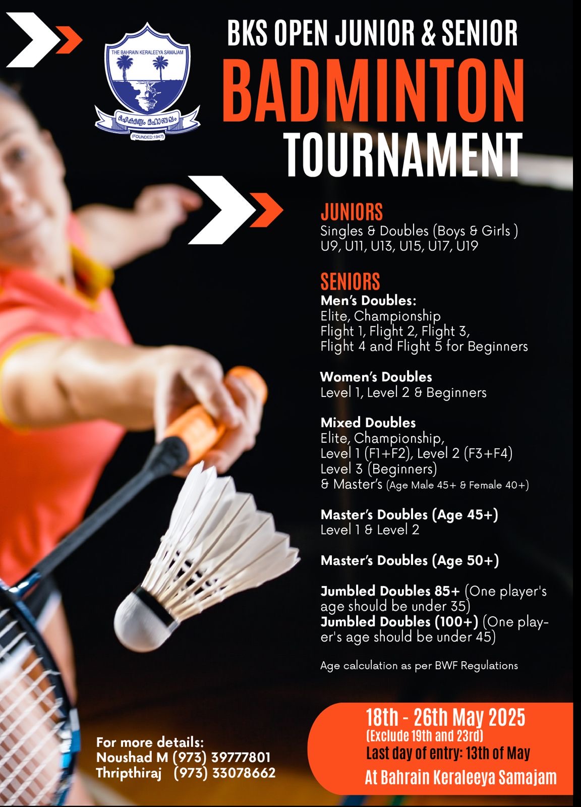 മനാമ: ബഹ്റൈൻ കേരളീയ സമാജം ഇൻഡോർ ഗയിംസ് വിഭാഗം സംഘടിപ്പിക്കുന്ന ബി.കെ.എസ് ഓപ്പൺ ജുനിയർ – സീനിയർ ബാഡ്മിൻ്റൺ ടൂർണമെൻ്റ് മെയ് 18 ന് ആരംഭിക്കും. വിവിധ വിഭാഗങ്ങളിലായി നടക്കുന്ന മത്സരങ്ങൾ മെയ് 26 വരെ നീണ്ടു നിൽക്കുമെന്ന് സമാജം പ്രസിഡൻ്റ് പി.വി.രാധാകൃഷ്ണപിള്ളയും ജനറൽ സെക്രട്ടറി വർഗ്ഗീസ് കാരക്കലും അറിയിച്ചു.