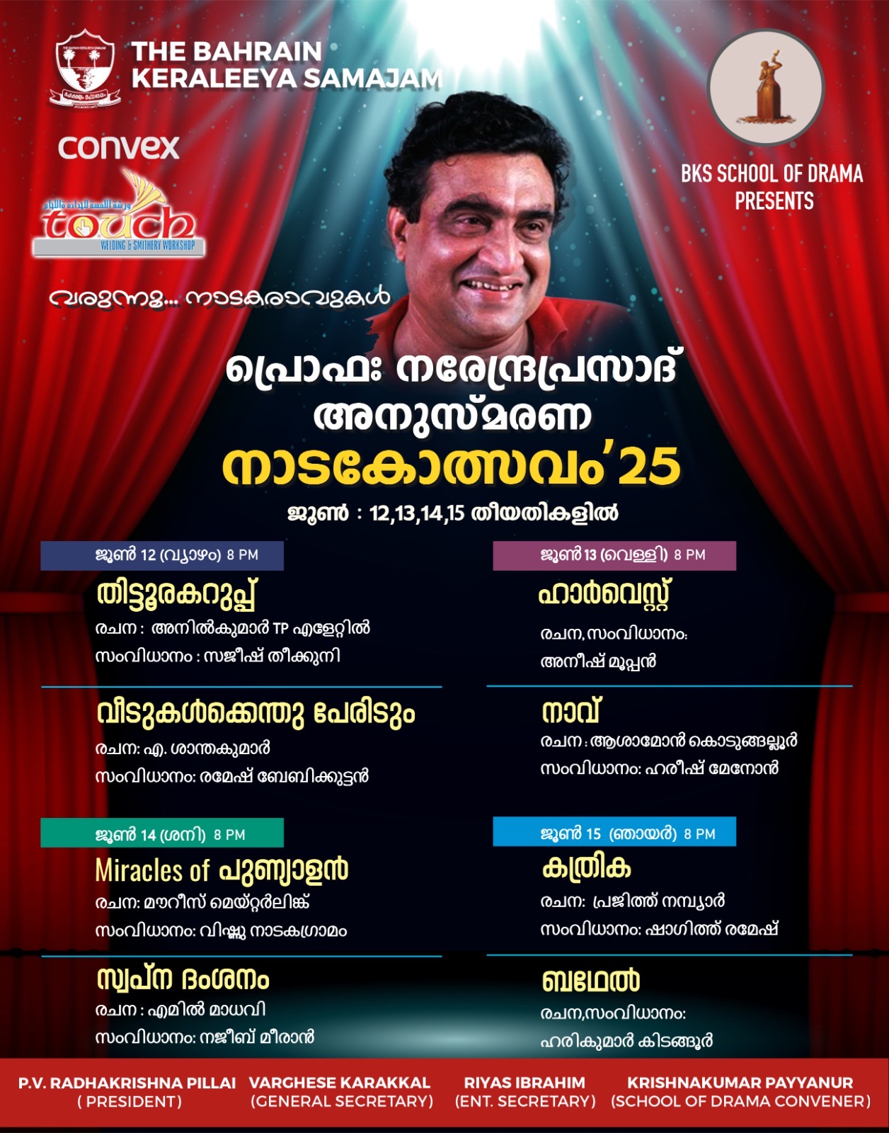 മനാമ: ബഹ്റൈൻ കേരളീയ സമാജം സ്കൂൾ ഓഫ് ഡ്രാമയുടെ ആഭിമുഖ്യത്തിൽ കോൺവെക്സ് മീഡിയയുടെ സഹകരണത്തോടെ പ്രൊഫ. നരേന്ദ്രപ്രസാദ് അനുസ്മരണ നാടകോത്സവം ജൂൺ 12 മുതൽ 15 വരെ നടക്കും. നാല് ദിവസങ്ങളിലായി എട്ട് നാടകങ്ങൾ അവതരിപ്പിക്കപ്പെടുന്ന ഈ നാടകോത്സവത്തിന്റെ ആദ്യ ദിനം അനിൽകുമാർ ടിപി എളേറ്റിലിന്റെ രചനയിൽ സജീഷ് തീക്കുനി സംവിധാനം ചെയ്യുന്ന ’’തിട്ടൂരകറുപ്പ്”, എ. ശാന്തകുമാറിന്റെ രചനക്ക് രമേഷ് ബേബിക്കുട്ടൻ സംവിധാനം ചെയ്യുന്ന ’’ വീടുകൾക്കെന്തു പേരിടും’’ എന്നീ നാടകങ്ങൾ അരങ്ങുണർത്തും.