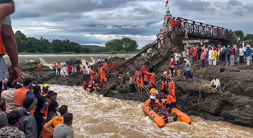 മഹാരാഷ്ട്രയിലെ പൂനെ ജില്ലയിൽ, തലേഗാവിനടുത്തുള്ള ഇന്ദ്രയാനി നദിക്ക് കുറുകെയുള്ള 30 വർഷം പഴക്കമുള്ള ഒരു ഇടുങ്ങിയ പാലം തകർന്നു വീണു. ഈ ദുരന്തത്തിൽ നാല് പേർ മരിക്കുകയും 50-ലധികം പേർക്ക് പരിക്കേൽക്കുകയും ചെയ്തു. വാരാന്ത്യത്തിൽ പെയ്ത കനത്ത മഴയെത്തുടർന്ന് പാലത്തിൽ നിന്ന് നിരവധി വിനോദസഞ്ചാരികൾ നദിയിലേക്ക് വീഴുകയായിരുന്നു. അവരിൽ ചിലർ ഒഴുക്കിൽപ്പെട്ടതായും റിപ്പോർട്ടുണ്ട്. ഏകദേശം 15 മണിക്കൂറിന് ശേഷം ഇന്ന് രാവിലെയാണ് രക്ഷാപ്രവർത്തനം അവസാനിച്ചത്. ആകെ 55 പേരെ രക്ഷപ്പെടുത്തിയതായി ഉദ്യോഗസ്ഥർ അറിയിച്ചു. മരിച്ച നാല് പേരിൽ മൂന്ന് പേരെ തിരിച്ചറിഞ്ഞിട്ടുണ്ട്.