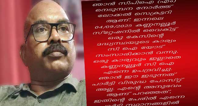 കൊല്ലം: പോലീസിനെതിരെ ഫേസ്ബുക്ക് പോസ്റ്റുമായി സിപിഎം ലോക്കൽ സെക്രട്ടറി. നെടുമ്പന നോർത്ത് ലോക്കൽ സെക്രട്ടറി സജീവാണ് കൊല്ലം കണ്ണനല്ലൂർ പോലീസ് തന്നെ മർദിച്ചെന്ന ആരോപണവുമായി രംഗത്തെത്തിയത്. വ്യാഴാഴ്ച ഒരു കേസിൻറെ മധ്യസ്ഥ ചർച്ചയ്ക്കായി സ്റ്റേഷനിലെത്തിയ തന്നെ സിഐ ഒരു കാരണമില്ലാതെ ഉപദ്രവിച്ചെന്ന് സജീവ് പറഞ്ഞു. താൻ ഈ ഇടുന്നതു പാർട്ടി വിരുദ്ധ പോസ്റ്റ് അല്ലെന്നും ഇതിൻറെ പേരിൽ സ്ഥാനങ്ങളിൽ നിന്ന് നീക്കം ചെയ്താൽ കുഴപ്പമില്ലെന്നും ലോക്കൽ സെക്രട്ടറി കുറിച്ചു. സിപിഎം ലോക്കൽ സെക്രട്ടറിയുടെ പോസ്റ്റ് ഇങ്ങനെ- ‘അനുഭവങ്ങൾ […]