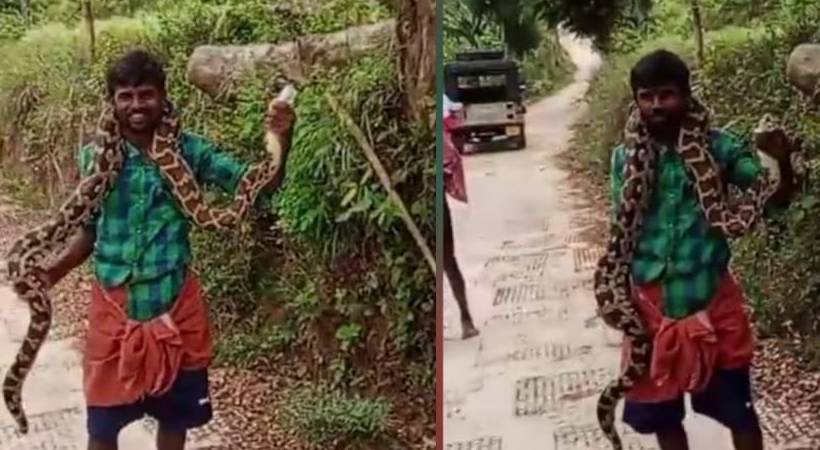 ജനവാസ കേന്ദ്രത്തിൽ മലമ്പാമ്പിനെ കണ്ടതിനെത്തുടർന്ന് പ്രദേശവാസികൾ വനം വകുപ്പ് ഉദ്യോഗസ്ഥരെ വിവരം അറിയിച്ചിരുന്നു. വനപാലകർ സ്ഥലത്തെത്തിയപ്പോഴാണ് അപ്രതീക്ഷിതമായി ഈ ദൃശ്യം കണ്ടത്. പ്രദേശവാസിയായ യുവാവ്, വലിപ്പമേറിയ മലമ്പാമ്പിനെ ധൈര്യപൂർവ്വം തന്റെ കഴുത്തിൽ ചുറ്റി നിൽക്കുകയായിരുന്നു. കാഴ്ച കാണാനായി നിരവധി നാട്ടുകാർ ഇദ്ദേഹത്തിന് ചുറ്റും തടിച്ചുകൂടിയിരുന്നു. ഇയാൾ ഏറെനേരം പാമ്പിനെ കഴുത്തിലിട്ട് പ്രദർശിപ്പിക്കുന്നതിന്റെയും നാട്ടുകാർ നോക്കിനിൽക്കുന്നതിന്റെയും ദൃശ്യങ്ങൾ സമൂഹമാധ്യമങ്ങളിൽ പ്രചരിക്കുകയും ചെയ്തു.