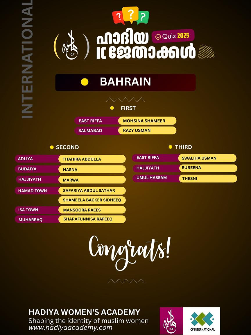 താഹിറ അബ്ദുള്ള ( അദ്ലിയ),, ഹസ്ന (ബുദയ),, മർവ (ഹാജിയാത്ത്), സഫരിയ്യ അബ്ദുൽ സത്താർ ( ഹമദ് ടൗൺ ) ശമീല ബക്കർ സിദ്ദീഖ് ( ഹമദ് ടൗൺ, മൻസൂറ റയീസ് ( ഇസാ ടൗൺ ),, ഷറഫുന്നിസ റഫീഖ് (മുഹറഖ്) എന്നിവർ രണ്ടാം സ്ഥാനവും സ്വാലിഹ ഉസ്മാൻ (ഈ സ്റ്റ് റിഫ), റുബീന (ഹാജിയാത്ത്) , തസ്നി (ഉമ്മുൽ ഹസം ) എന്നിവർ മൂന്നാം സ്ഥാനവും കരസ്ഥമാക്കി.
