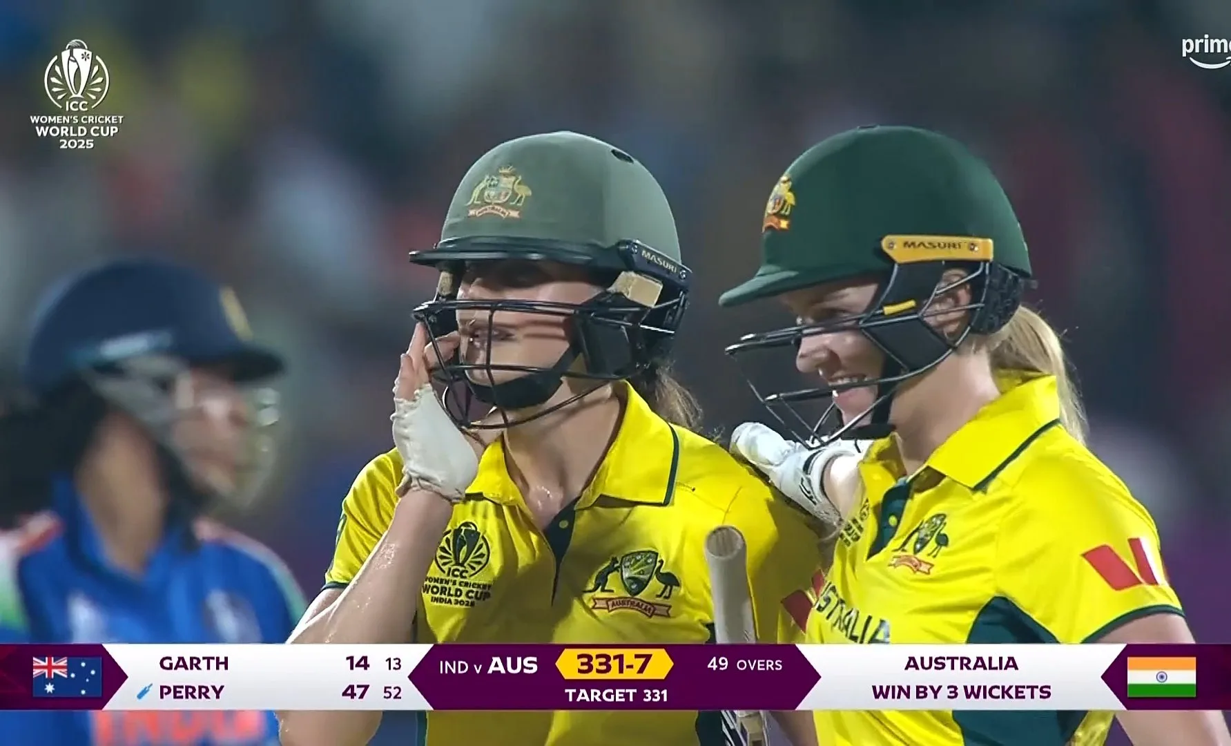 വിശാഖപട്ടണം: വനിതാ ലോകകപ്പിൽ ഇന്ത്യയ്ക്ക് രണ്ടാം തോൽവി. 331 റൺസ് വിജയലക്ഷ്യം ഓസ്ട്രേലിയ ചെയ്സ് ചെയ്ത് ചരിത്രത്തിൽ ഏറ്റവും വലിയ വിജയലക്ഷ്യം നേടിയാണ് ഇന്ത്യയെ തോൽപ്പിച്ചത്. ഇന്ത്യ ബാറ്റിങ്ങിന് ഇറങ്ങിയപ്പോഴാണ് 48.5 ഓവറിൽ 330 റൺസ് സ്കോർ ചെയ്തത്. സ്മൃതി മന്ദാൻ 66 പന്തിൽ തിളങ്ങിയ 80 റൺസും, പ്രതിക റാവൽ 75 റൺസും നേടി.