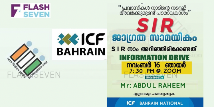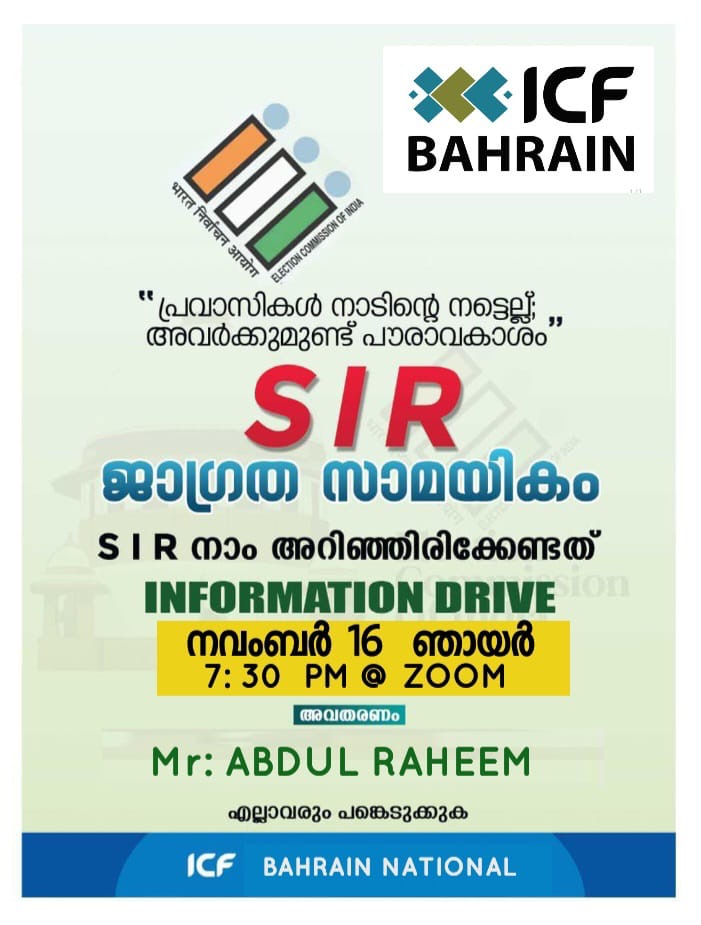 മനാമ: കേരളത്തിൽ ആരംഭിച്ച വോട്ടർ പട്ടികയുടെ തീവ്ര വോട്ടർ പട്ടിക പരിഷ്കരണത്തിൽ (എസ് ഐ ആർ) പ്രവാസികളെ ബോധവൽകരിക്കുന്നതിനും ആവശ്യമായ നിർദേശങ്ങൾ നൽകുന്നതിനുമായി.ഇന്ത്യൻ ക്ൾച്ചറൽ ഫൗണ്ടേഷൻ (ഐ.സി എഫ് ) ബഹ്റൈൻ ആചരിച്ചു വരുന്ന ജാഗ്രതാകാമ്പയിനിന്റെ ഭാഗമായി സംഘടിപ്പിക്കുന്ന ബോധവൽകരണ സംഗമം നാളെ (നവംബർ 16ന്) ഓൺലൈനിൽ നടക്കും.