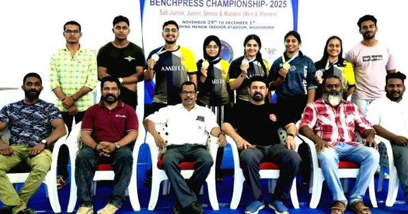 കരുനാഗപ്പള്ളി: കോഴിക്കോട് വി. കെ. മേനോന് ഇന്ഡോര് സ്റ്റേഡിയത്തില് നടന്ന കേരളാ സ്റ്റേറ്റ് ക്ലാസ്സിക് ആന്റ് എക്യുപ്മെന്റ് ബെഞ്ച് പ്രസ് ചാമ്പ്യന്ഷിപ്പില് ആറു മെഡലുകളുമായി മികച്ച പ്രകടനം കാഴ്ച്ചവച്ച് അമൃത വിശ്വവിദ്യാപീഠം. വിവിധ വിഭാഗങ്ങളിലായി രണ്ട് സ്വര്ണവും മൂന്ന് വെള്ളിയും ഒരു വെങ്കലവും നേടിയാണ് അമൃത വിശ്വവിദ്യാപീഠം മികച്ച നേട്ടം കൈവരിച്ചത്.