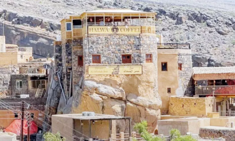 മിസ്ഫ ഗ്രാമത്തിൽ പാറക്കെട്ടിന് മുകളിലെ കെട്ടിടം