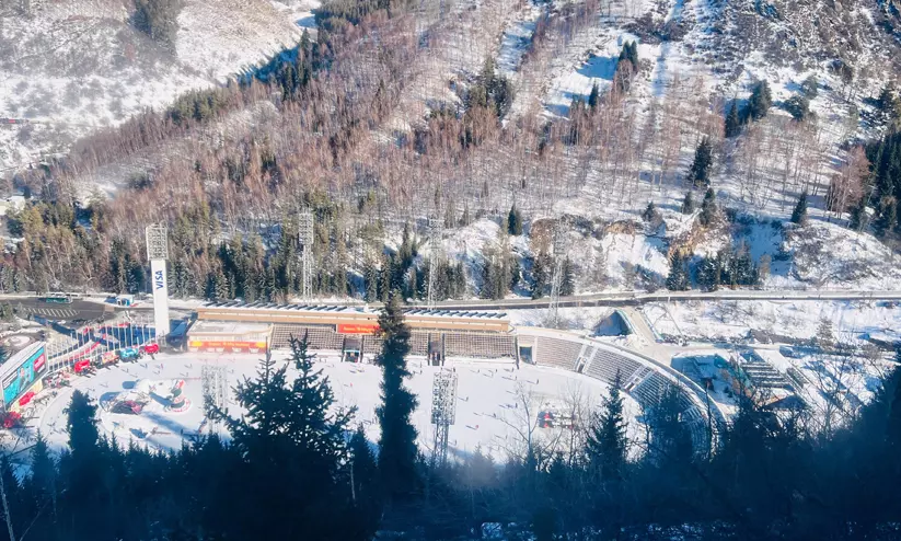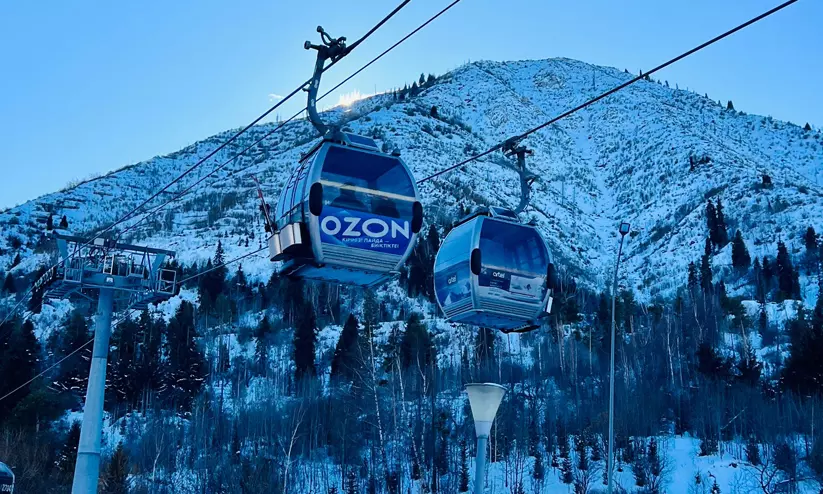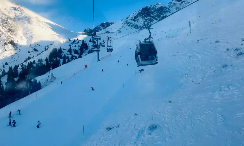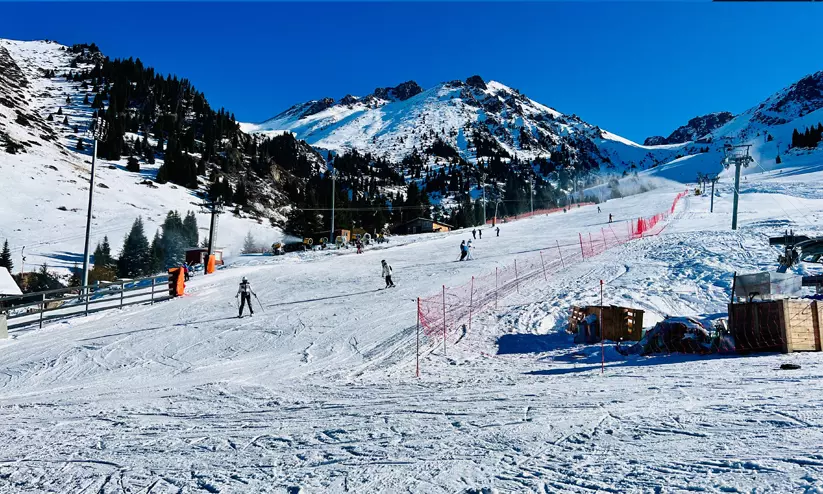 ഞങ്ങള് മെഡ്യൂ ബേസ് സ്റ്റേഷനില്നിന്ന് കേബിൾ കാര്യാത്ര ആരംഭിച്ചു. ഏകദേശം 1.5 മീറ്റർ വിസ്തൃതിയുള്ള കേബിൾ കാര് മുഴുവൻ മൂടിയനിലയിലാണ്. നീളമുള്ള സ്കീയിങ് ഉപകരണങ്ങള് പുറത്തുവെക്കാന് സൗകര്യമുണ്ടെങ്കിലും പലരും അതുമായി ഉള്ളിലേക്ക് കയറി ഗ്ലാസ് മുഴുവന്പോറൽ വീണനിലയിലായിരുന്നു. കേബിൾ കാറിലൂടെയുള്ള യാത്ര അനിർവചനീയമായിരുന്നു. വെള്ള പുതച്ച മലനിരകൾ ചുറ്റിലും, പൈൻ മരങ്ങളുടെയും കോണിഫറസ് മരങ്ങളുടെയും മുകളിലൂടെ ഒഴുകി നീങ്ങുന്ന കേബിൾ കാർ. മലയുടെ ചില ഭാഗങ്ങളിൽ വീടുകൾ കാണാം, സമീപമായി കുതിരകൾ മേഞ്ഞു നടക്കുന്നു. ഏകദേശം 30 മിനിറ്റെടുത്തു സമുദ്രനിരപ്പിൽ നിന്ന് 2,260 മീറ്റർ ഉയരത്തിലുള്ള ആദ്യ സ്റ്റോപ്പില് എത്താന്. മധ്യേഷ്യയിലെ ഏറ്റവും വലിയ സ്കീ റിസോർട്ടായ ഷിമ്പലാക് സ്കീ റിസോര്ട്ട് ഇവിടെയാണ്. ഹോട്ടലില്നിന്ന് സ്കീ, സ്നോബോർഡ്, സ്ലീ എന്നിവ വാടകക്കും നൽകാറുണ്ട്. നവംബർ മുതൽ മേയ് വരെ മലകൾ മഞ്ഞുമൂടിയ നിലയിലാവും ആ സമയത്താണ് സഞ്ചാരികള് ഇവിടേക്കെത്തുന്നത്. 2023ല് ലോകത്തിലെ ഏറ്റവും ഉയർന്ന ചരിവില് നൈറ്റ് സ്കീ ഒരുക്കി ഷിമ്പുലാക് സ്കീ റിസോര്ട്ട് ഗിന്നസ് ബുക്ക് ഓഫ് റെക്കോഡ്സിൽ പ്രവേശിച്ചിരുന്നു. കാൽനടയാത്ര ഇഷ്ടപ്പെടുന്നവർക്ക് സ്കീ റിസോർട്ടിൽ എത്താം. കുത്തനെയുള്ള കയറ്റം ട്രക്കിങ്ങിന് വെല്ലുവിളിയാണെങ്കിലും സ്കീയിങ്ങില് ഭ്രാന്തുള്ളവര് അതിലും ആനന്ദം കണ്ടെത്തുന്നു. സ്കീയിങ്ങിലും സ്നോബോർഡിലുമായി നിരവധിപേർ അർമാദിക്കുകയാണ്. ഈ സ്റ്റേഷനില് സ്കീ റിസോര്ട്ട് കൂടാതെ മറ്റ് ഹോട്ടലുകൾ, റസ്റ്റാറന്റുകള്, കോഫി ഷോപ്പുകൾ, ബാറുകൾ, സ്കീയുങ്ങുമായി ബന്ധപ്പെട്ട ഷോപ്പുകള് എന്നിവയുമുണ്ട്