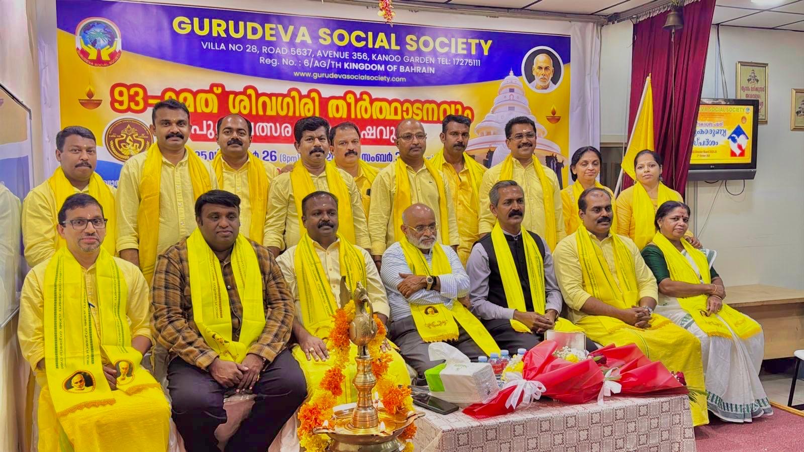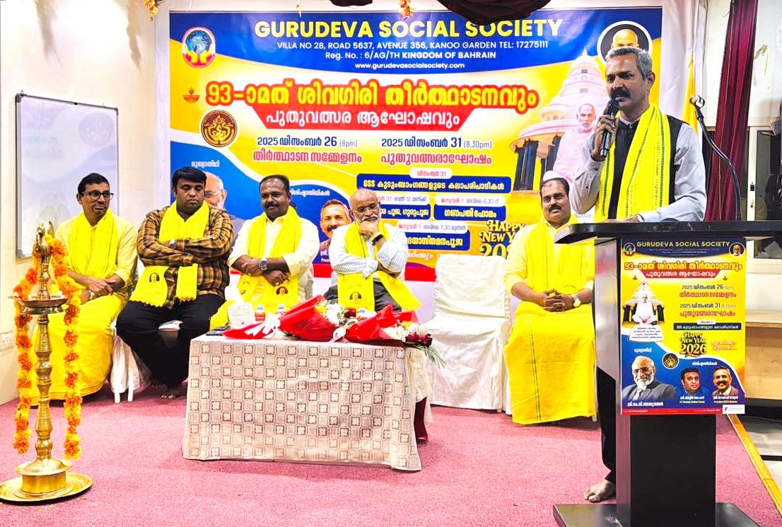 മനാമ: സൽമാനിയ കാനു ഗാർഡനിൽ പ്രവർത്തിക്കുന്ന ഗുരുദേവ സോഷ്യൽ സൊസൈറ്റി 93 മത് ശിവഗിരി തീർത്ഥാടനത്തിന്റെ ഭാഗമായി വിപുലമായ രീതിയിൽ തീർത്ഥാടന സമ്മേളനം സംഘടിപ്പിച്ചു. കഴിഞ്ഞദിവസം സൊസൈറ്റിയിലെ കുമാരനാശാൻ ഹാളിൽ കുടുംബാംഗങ്ങളും കുട്ടികളും പങ്കെടുത്ത ചടങ്ങിൽ ശിവഗിരി തീർഥാടന കമ്മിറ്റി മുൻ ചെയർമാനും പ്രവാസി ഭാരതീയ സമ്മാൻ അവാർഡ് ജേതാവുമായ കെ.ജി ബാബുരാജൻ മുഖ്യാതിഥി ആയിരുന്നു, കെ. എസ്. സി. എ പ്രസിഡൻറ് രാജേഷ് നമ്പ്യാർ ഇന്ത്യൻ സ്കൂൾ ഡയറക്ടർ ബോർഡ് അംഗവും ജി. എസ്. എസ് കുടുംബാംഗവുമായ മിഥുൻ മോഹൻ എന്നിവർ വിശിഷ്ട അതിഥികളായി പങ്കെടുത്ത് ആശംസകൾ നേർന്നു.