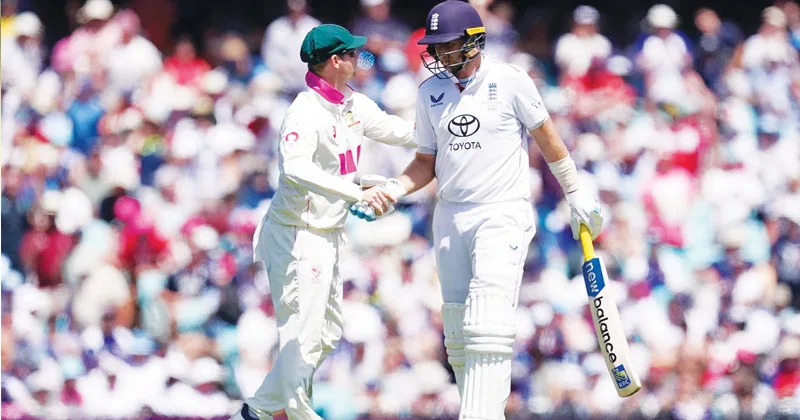 നേരത്തെ തലേന്നത്തെ സ്കോറിനോട് 173 റണ്സ് കൂടി ചേര്ത്തുകൊണ്ട് ഇംഗ്ലണ്ട് ഇന്നിങ്സ് അവസാനിച്ചു. മൂന്നിന് 211 റണ്സെന്ന നിലയില് ബാറ്റിങ് ആരംഭിച്ച ഇംഗ്ലണ്ടിനായി ക്രീസിലുണ്ടായിരുന്ന ഹാരി ബ്രൂക്ക്(84) കൂടുതല് സമയം പിടിച്ചു നിന്നില്ല. സെഞ്ചുറി പ്രകടനത്തോടെ മുന്നേറിയ ജോ റൂട്ടിന്റെ ഇന്നിങ്സ് ആണ് ഇംഗ്ലണ്ടിന്റെ ഭേദപ്പെട്ട ടോട്ടലിന്റെ അടിത്തറയായത്. 242 പന്തുകള് നേരിട്ട റൂട്ട് 15 ബൗണ്ടറികള് സഹിതം 160 റണ്സ് നേടി ഒമ്പതാമനായാണ് പുറത്തായത്. റൂട്ടിന് ശേഷം ഒരു റണ് പോലും കൂട്ടിചേര്ക്കാതെ രണ്ടാം പന്തില് ഇംഗ്ലണ്ടിന്റെ ആദ്യ ഇന്നിങ്സ് അവസാനിച്ചു. ഹാരി ബ്രൂക്കിന് ശേഷം വിക്കറ്റ് കീപ്പര് ജാമീ സ്മിത്തും(46) വില് ജാക്സും(27) മികച്ച പോരാട്ടവീര്യം കാട്ടി. ഓസ്ട്രേലിയക്കായി നെസര് നാല് വിക്കറ്റ് നേടി. മറ്റ് ബൗളര്മാരില് മിച്ചല് സ്റ്റാര്ക്കും സ്കോട്ട് ബോളണ്ടും രണ്ട് വീതം വിക്കറ്റുകള് നേടി.