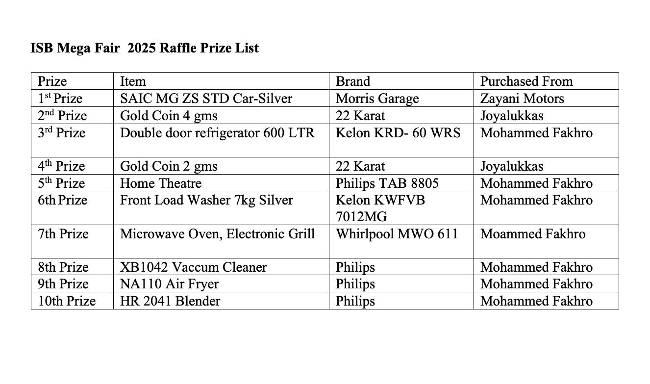 വൈവിധ്യമാർന്ന സമ്മാന പട്ടിക പ്ലാറ്റിനം ജൂബിലി മെഗാ ഫെയറിന്റെ വ്യാപ്തിയും സമൂഹത്തിന്റെ വിവിധ കോണുകളിൽ നിന്നും സ്കൂളിന് ലഭിക്കുന്ന മികച്ച പിന്തുണയും പ്രതിഫലിപ്പിക്കുന്നു. ഇന്ത്യൻ സ്കൂൾ മെഗാ ഫെയറിലേക്കുള്ള പ്രവേശനത്തിന് ടിക്കറ്റിനു 2 ദിനാർ ആയിരിക്കും. പൊതുജനപങ്കാളിത്തത്തിൽ ഇന്ത്യൻ സ്കൂളിന്റെ ചരിത്രത്തിൽ ഇതുവരെ സംഘടിപ്പിച്ചിട്ടുള്ളതിൽ വച്ച് ഏറ്റവും വലിയ സാംസ്കാരിക മേളയായിരിക്കും ഇത്തവണ സംഘടിപ്പിക്കുന്ന വാർഷിക ഫെയർ. രണ്ട് ദിവസത്തെ പരിപാടിയിൽ പതിനായിരക്കണക്കിന് വിദ്യാർത്ഥികൾ, രക്ഷിതാക്കൾ, പൂർവ്വ വിദ്യാർത്ഥികൾ, സന്ദർശകർ എന്നിവർ ഒത്തുചേരുമെന്ന് പ്രതീക്ഷിക്കപ്പെടുന്നു. മേളയുടെ വിജയത്തിനായി വിപുലമായ ഒരുക്കങ്ങൾ നടക്കുന്നുവരുന്നു. ലോജിസ്റ്റിക്സ്, പ്രോഗ്രാമുകൾ, സ്പോൺസർഷിപ്പുകൾ, അടിസ്ഥാന സൗകര്യങ്ങൾ എന്നിവയുമായി ബന്ധപ്പെട്ട കമ്മിറ്റികൾ സജീവമായി പ്രവർത്തിച്ചു വരുന്നു. അധ്യാപക വിദ്യാർത്ഥി ക്ഷേമ സംരംഭങ്ങൾക്കായാണ് മേള സംഘടിപ്പിക്കുന്നത്. പ്രശസ്ത കലാകാരന്മാർ പങ്കെടുക്കുന്ന സംഗീത മേള പരിപാടിയുടെ ഭാഗമായി ഒരുക്കിയിരിക്കുന്നു. ജനുവരി 15നു വ്യാഴാഴ്ച പ്രശസ്ത സംഗീതജ്ഞനും സംഗീതസംവിധായകനുമായ സ്റ്റീഫൻ ദേവസ്സിയും സംഘവും അവതരിപ്പിക്കുന്ന തത്സമയ സംഗീത കച്ചേരിയോടെ ആഘോഷങ്ങൾ ആരംഭിക്കും. കീബോർഡിലെ വൈദഗ്ധ്യത്തിനും നൂതനമായ സംഗീത സംയോജനത്തിനും പരക്കെ പ്രശംസ നേടിയ സ്റ്റീഫൻ ദേവസി, തന്റെ പ്രകടനങ്ങൾക്ക് ദേശീയവും അന്തർദേശീയവുമായ നിരവധി അംഗീകാരം നേടിയ കലാകാരനാണ്. ജനുവരി 16ന് വിദ്യാർത്ഥികളുടെ സാംസ്കാരിക പരിപാടികളോടെ ആഘോഷങ്ങൾ തുടരും, തുടർന്ന് പ്രശസ്ത പിന്നണി ഗായിക രൂപാലി ജഗ്ഗ നയിക്കുന്ന ഇമ്പമാർന്ന സംഗീത സായാഹ്നം അരങ്ങേറും. ഗായകൻ അഭിഷേക് സോണിയും സംഘവും ഒപ്പമുണ്ടാകും. മികച്ച ആലാപന മാധുര്യത്തിനും ചലനാത്മകമായ വേദി സാന്നിധ്യത്തിനും പേരുകേട്ട രൂപാലി ജഗ്ഗ അവിസ്മരണീയമായ പ്രകടനം ഒരുക്കും. ഒരു വർഷം നീളുന്ന പ്ലാറ്റിനം ജൂബിലി ആഘോഷങ്ങളുടെ ഒരു പ്രധാന ആകർഷണമായിരിക്കും ഇന്ത്യൻ സ്കൂൾ മേള. ജനുവരി 18 ന് മന്ത്രാലയ പ്രതിനിധികളുടെ സാന്നിധ്യത്തിൽ ഔദ്യോഗിക ചട്ടങ്ങൾ പാലിച്ച് റാഫിൾ നറുക്കെടുപ്പ് നടക്കും. ഇന്ത്യൻ സ്കൂൾ പ്ലാറ്റിനം ജൂബിലി മേള വിജയമാക്കാൻ ഏവരുടെയും സഹകരണവും പിന്തുണയും ഉണ്ടാവണമെന്ന് സ്കൂൾ ചെയർമാൻ അഡ്വ. ബിനു മണ്ണിൽ വറുഗീസ്, മേളയുടെ ജനറൽ കൺവീനർ ആർ രമേഷ് എന്നിവർ സന്ദേശത്തിൽ അഭ്യർത്ഥിച്ചു. സ്കൂളിന്റെ പ്ലാറ്റിനം ജൂബിലി വർഷത്തിലെ ഒരു ചരിത്രപരമായ നാഴികക്കല്ലാണ് ഈ പരിപാടി. മാതാപിതാക്കൾ, പൂർവ്വ വിദ്യാർത്ഥികൾ, അഭ്യുദയകാംക്ഷികൾ, പൊതുജനങ്ങൾ എന്നിവരെയും വലിയ തോതിൽ നടക്കുന്ന ഈ ആഘോഷങ്ങളിൽ പങ്കുചേരാനും ഭാരവാഹി