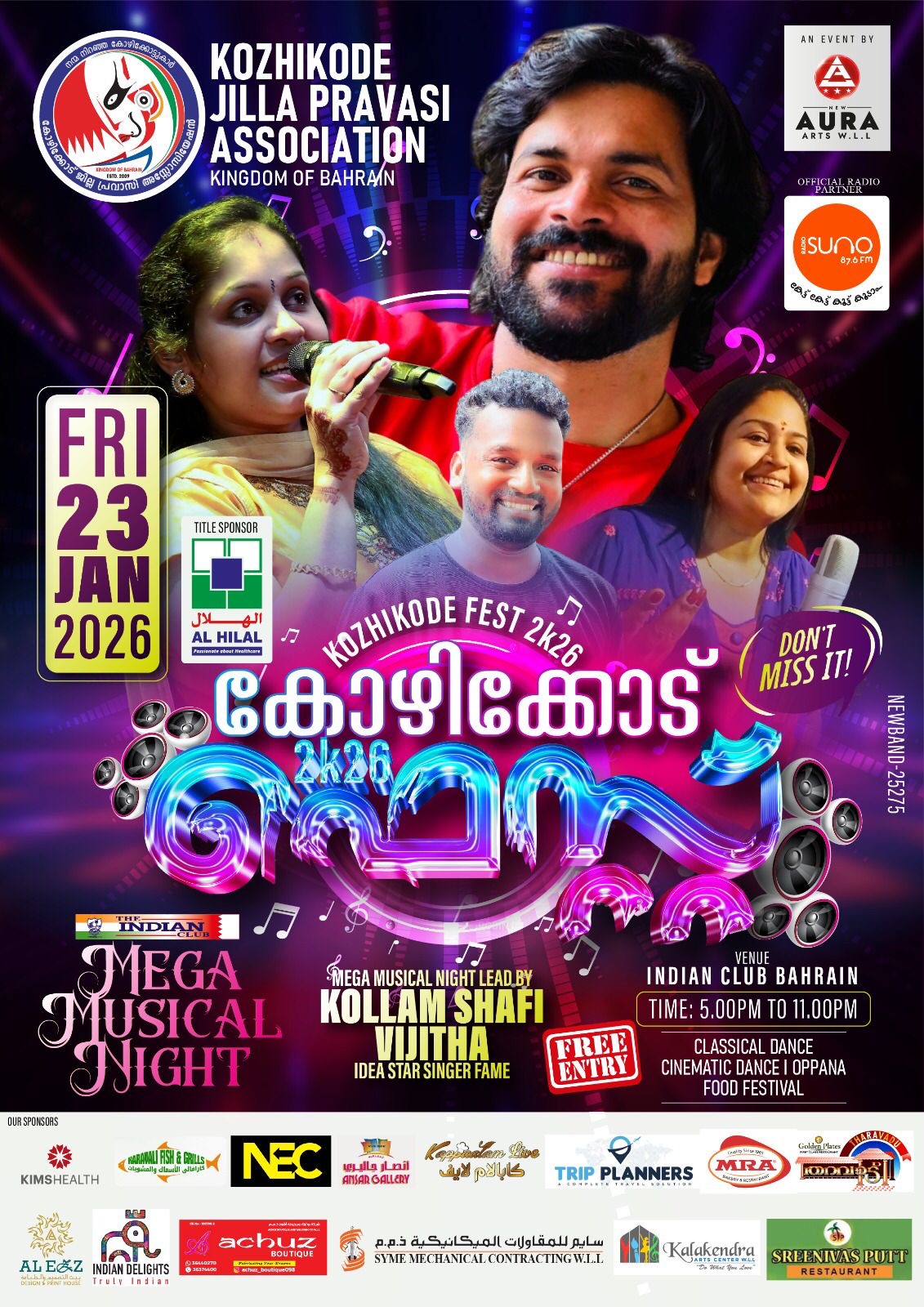 മനാമ: ബഹ്റൈനിലെ കലാസാംസ്ക്കാരിക ജീവകാരുണ്ണ്യപ്രവർത്തനരംഗത്തെ പ്രമുഖ സംഘടനയായ ബഹ്റൈൻ കോഴിക്കോട് ജില്ലാ പ്രവാസി അസോസിഷന്റെ 15 മത് വാർഷിക ആഘോഷം വിപുലമായ കലാപരിപാടികളോടെ നാളെ (23വെള്ളി)വൈകുന്നേരം 5 മണി മുതൽ രാത്രി 11 മണിവരെയായി ഇന്ത്യൻക്ലബ്ബ് ഓഡിറ്റോറിയത്തിൽ വച്ചു നടക്കും. ഓറആർട്സിന്റെ ബാനറിൽ “കോഴിക്കോട് ഫെസ്റ്റ് -2k26”എന്ന പേരിൽ നടത്തപ്പെടുന്ന മെഗാഷോയിൽ പ്രശസ്ത ചലച്ചിത്ര പിന്നണി ഗായകനും സ്റ്റാർമാജിക്ക് താരവുമായ കൊല്ലം ഷാഫി,ഐഡിയ സ്റ്റാർ സിംഗർഫെയിം വിജിത,മിഥുൻമുരളീധരൻ,ചലച്ചിത്ര പിന്നണിഗായിക സ്മിത തുടങ്ങിയവർ നയിക്കുന്ന ഗാനമേളയും,അസ്സോസിയേഷൻ അംഗങ്ങളും കുട്ടികളും അവതരിപ്പിക്കുന്ന വിവിധ കലാപരിപാടികളും ഉണ്ടായിരിക്കുന്നതാണ്. സ്റ്റേജ് ഷോ സംവിധായകനായ മനോജ് മയ്യന്നൂരാണ് പ്രോഗ്രാം സംവിധാനം നിർവ്വഹിക്കുന്നത്.