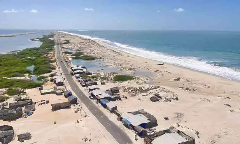 ശാന്തമായി കിടക്കുന്ന ബംഗാൾ ഉൾക്കടലിനും തിരകൾ ഒച്ചയുണ്ടാക്കുന്ന ഇന്ത്യൻ മഹാസമുദ്രത്തിനും നടുവിലൂടെ നേർരേഖപോലെ നീണ്ടുകിടക്കുന്ന പാത ചെന്നവസാനിക്കുന്നത് ഭൂമിയുടെ ഒരറ്റമായ ധനുഷ്കോടിയിലേക്കാണ്. ഇവിടെനിന്ന് ശ്രീലങ്കൻ തീരത്തേക്ക് കടൽമാർഗം 18 കിലോമീറ്ററിൽ താഴെ മാത്രം ദൂരം. പുരാണ കഥയിൽ സീതയെ വീണ്ടെടുക്കാൻ ഹനുമാന്റെ വാനര സൈന്യത്തോടൊപ്പം കടലിൽ ചിറകെട്ടി രാവണന്റെ സാമ്രാജ്യത്തിലോട്ട് ശ്രീരാമൻ കടന്നുചെന്നത് ഇവിടെ നിന്നുമാണ് എന്നാണ് വിശ്വാസം. ആകാശ കാഴ്ച്ചയിൽ രാമസേതു ഇന്നും തെളിഞ്ഞ് കാണാമത്രേ.