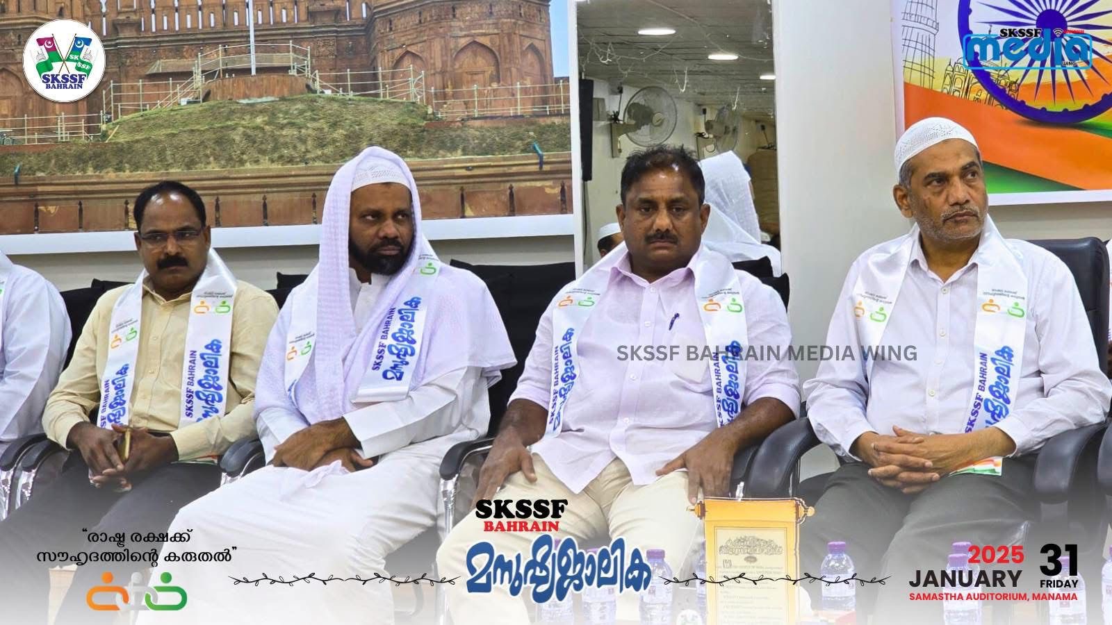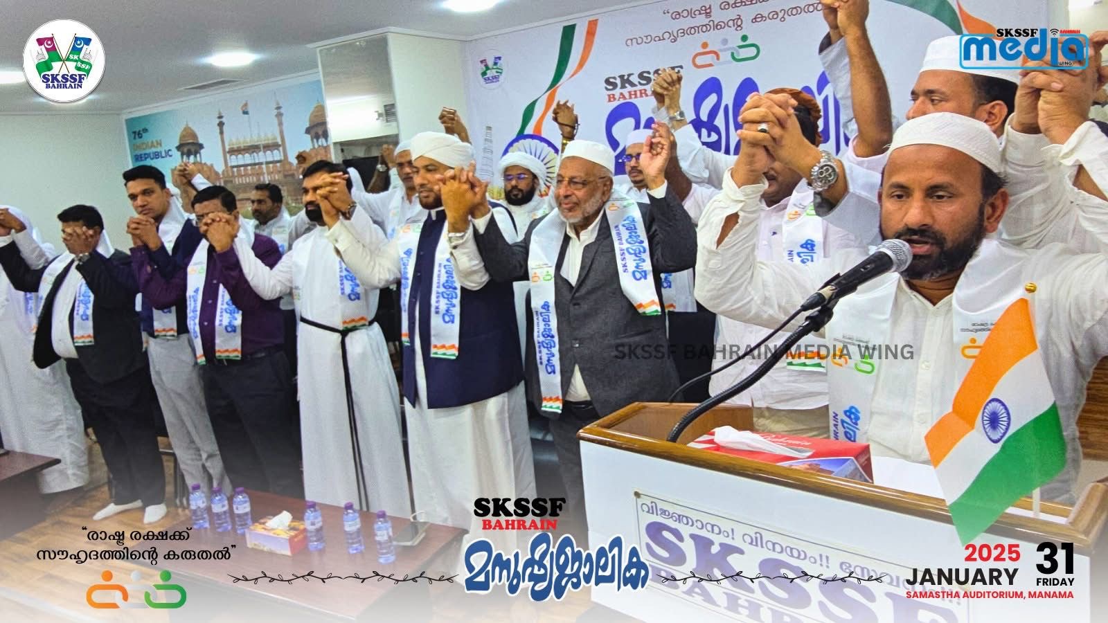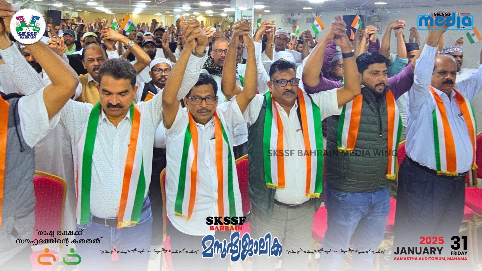 മനാമ: രാജ്യസ്നേഹത്തിൻ്റെയും സാഹോദര്യത്തിൻ്റെയും സ്നേഹകരങ്ങൾ കോർത്ത് ബഹ്റൈൻ എസ് കെ എസ് എസ് എഫ് മനുഷ്യജാലിക സംഘടിപ്പിച്ചു. ഇന്ത്യൻ റിപ്പബ്ലിക് ദിനാഘോഷത്തിൻ്റെ ഭാഗമായി “രാഷ്ട്ര രക്ഷക്ക് സൗഹൃദത്തിൻ്റെ കരുതൽ” എന്ന പ്രമേയത്തിൽ എസ് കെ എസ് എസ് എഫ് രാജ്യത്തിനകത്തും പുറത്തുമായി സംഘടിപ്പിച്ചു വരുന്ന മനുഷ്യജാലികയുടെ ഭാഗമായാണ് ബഹ്റൈൻ എസ് കെ എസ് എസ് എഫ് മനുഷ്യജാലിക സംഘടിപ്പിച്ചത്.