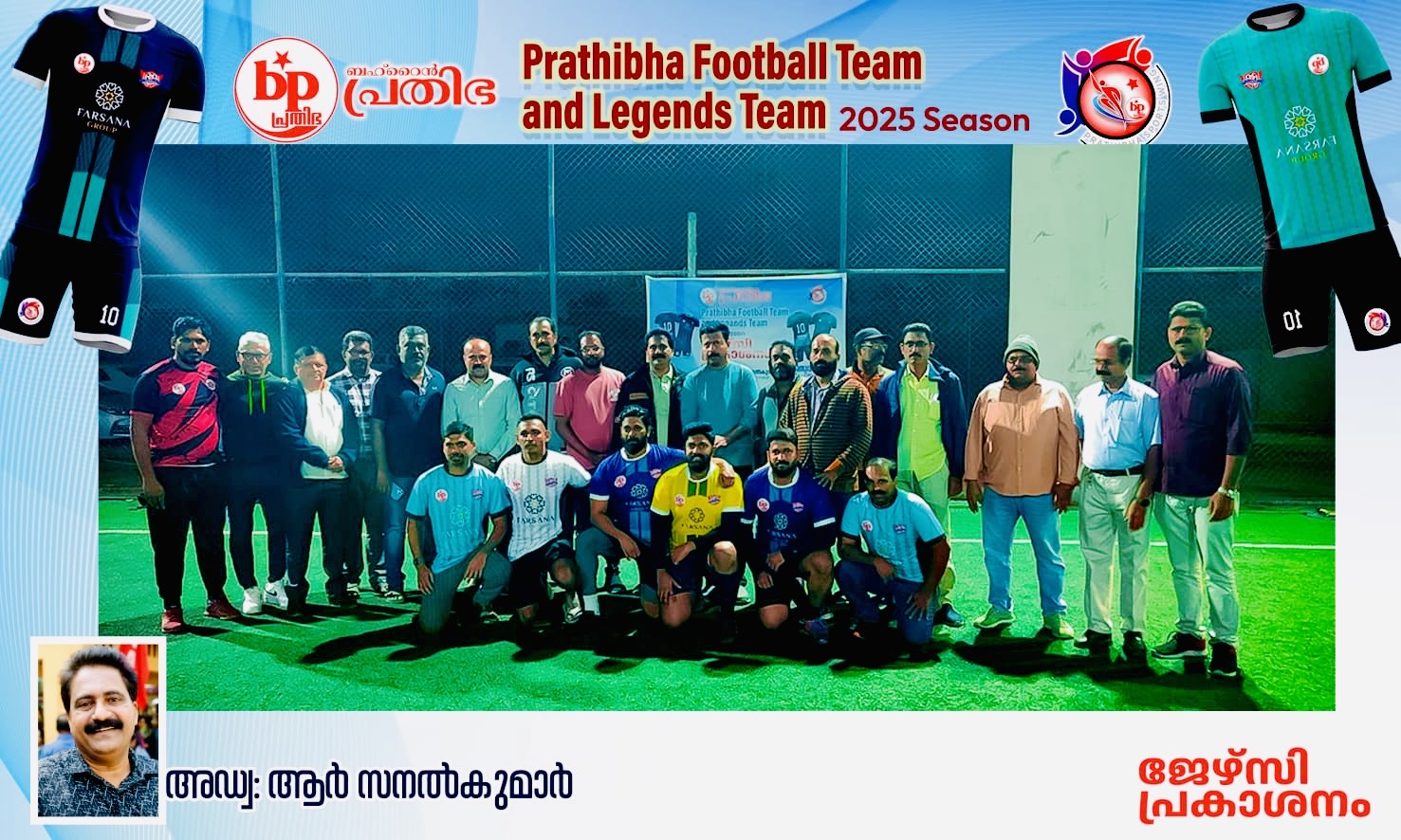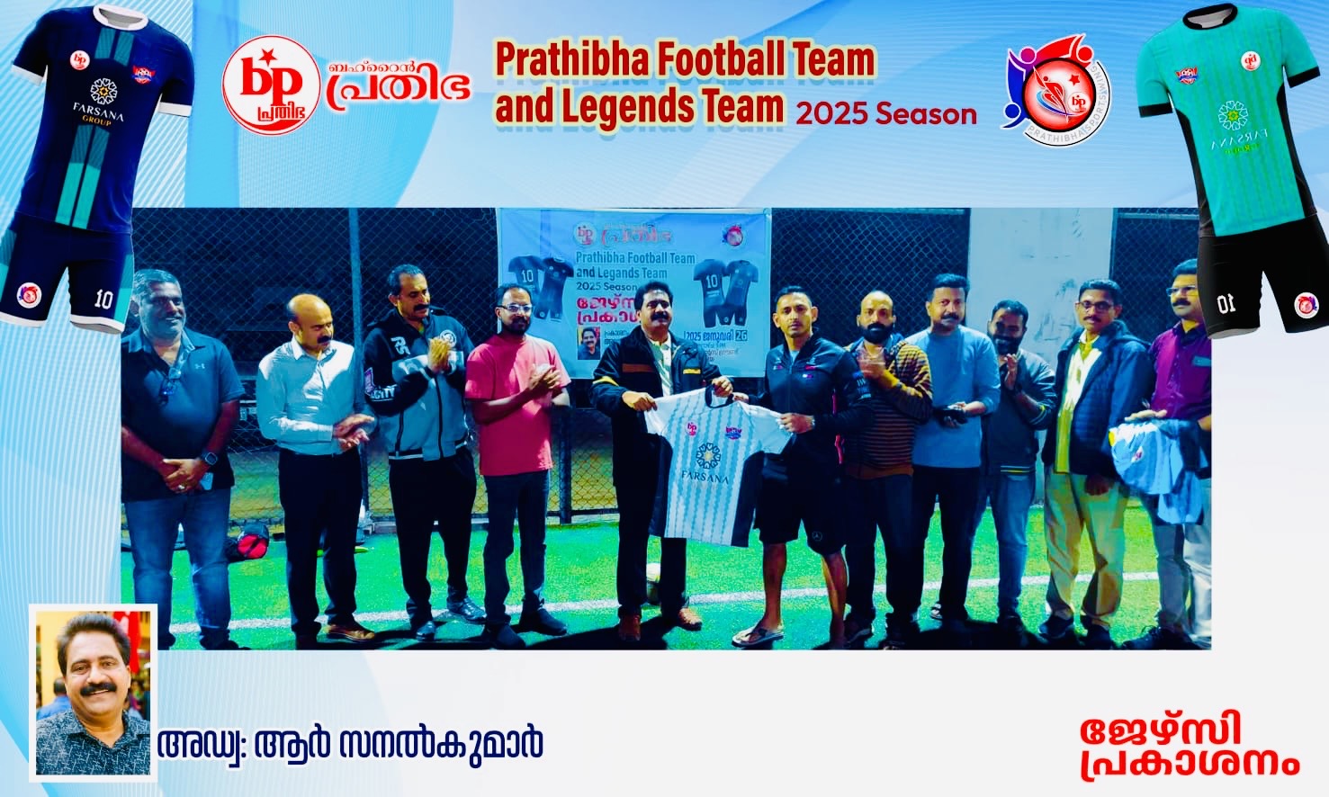 മനാമ: ബഹ്റൈൻ പ്രതിഭയുടെ ഫുട്ബോൾ ടീമുകളായ നാല്പത് വയസ്സിന് മുകളിലുള്ളവർ, സെമി പ്രൊഫഷണൽ എന്നീ വിഭാഗങ്ങൾക്കുള്ള പുതിയ ജേഴ്സി പുറത്തിറക്കി. ഖമ്മീസ് പ്രദേശത്തുള്ള ജുവേൻ്റെസ്സ് ഗ്രൗണ്ടിൽ നടന്ന ഹ്രസ്വമായ ചടങ്ങിൽ, കേരള സ്റ്റേറ്റ് കോഓപ്പറേറ്റീവ് എംപ്ലോയീസ് വെൽഫയർ ബോർഡ് വൈസ് ചെയർമാൻ അഡ്വ: ആർ. സനൽകുമാറാണ് ജഴ്സി പ്രകാശനം ചെയ്തത്.
