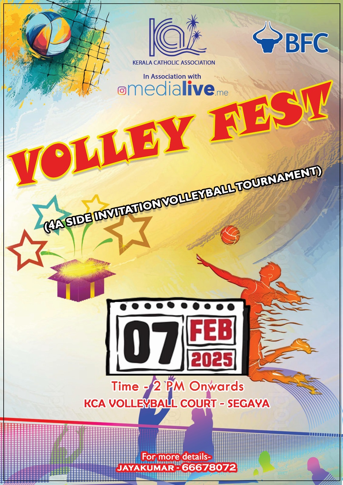 കേരള കാത്തലിക് അസോസിയേഷൻ നേതൃത്വത്തിൽ 4എ സൈഡ് വോളി ബാൾ ടൂർണമെന്റ് സംഘടിപ്പിക്കുന്നു. ഫെബ്രുവരി 7 വെള്ളിയാഴ്ച ഉച്ചക്ക് രണ്ടു മണി മുതൽ കെ സി എ ഗ്രൗണ്ടിൽ വച്ച് നടത്തുന്ന ടൂർണമെന്റിൽ ബഹ്റൈനിലെ 6 പ്രമുഖ ടീമുകൾ മത്സരിക്കുന്നു. റൈസൻ മാത്യു കൺവീനറും, ജയകുമാർ വൈസ് കൺവീനറും, അനൂപ് കോഡിനേറ്ററുമായ കമ്മിറ്റിയാണ് ടൂർണമെന്റ് നിയന്ത്രിക്കുന്നത്. ഒന്നും രണ്ടും സ്ഥാനക്കാർക്ക് അവാർഡും ട്രോഫികളും നൽകും. കൂടാതെ ബെസ്റ്റ് സെറ്റർ , ബെസ്റ്റ് അറ്റാക്കർ, പ്ലെയർ ഓഫ് ദി ടൂർണമെന്റ്, ടീം ഫെയർ പ്ലേ അവാർഡ് എന്നീ അവാർഡുകളും സമ്മാനിക്കുമെന്ന് സംഘാടകർ അറിയിച്ചു.