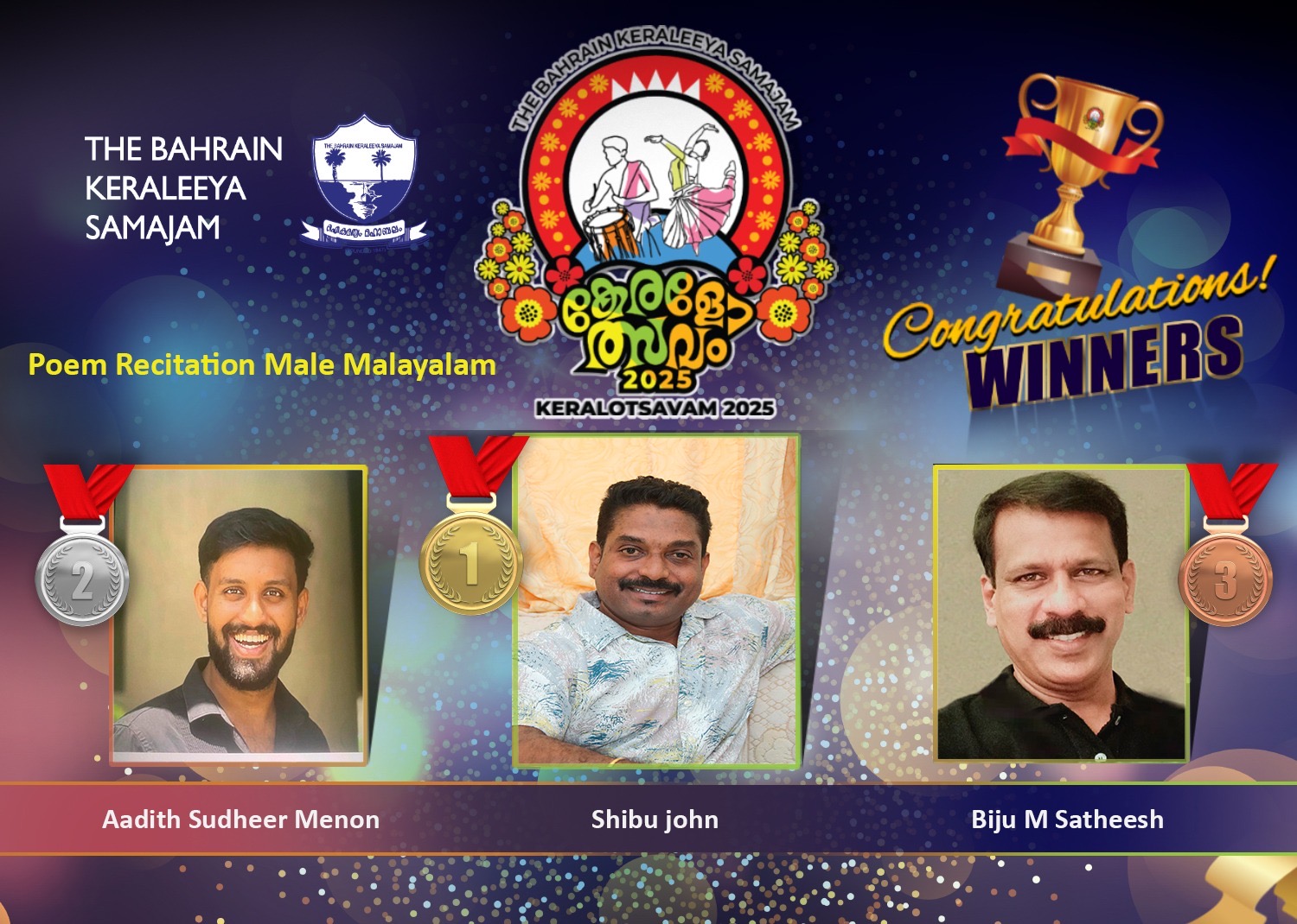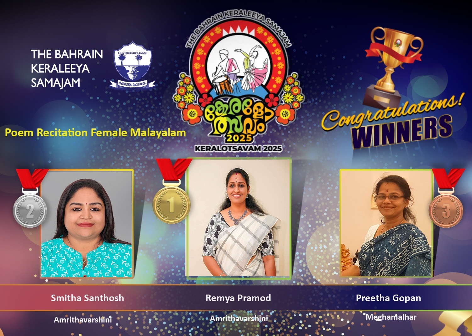 മനാമ: ബഹ്റൈൻ കേരളീയ സമാജത്തിൽ സമാജം കുടുംബാഗങ്ങൾക്കായി ഒരുതിയിരിക്കുന്ന “കേരളോത്സവം 2025” ന്റെ ഭാഗമായുള്ള പുരുഷൻമാരുടെയും വനിതകളുടെയും കവിതാലാപന മത്സരഫലങ്ങൾ പ്രഖ്യാപിച്ചു.