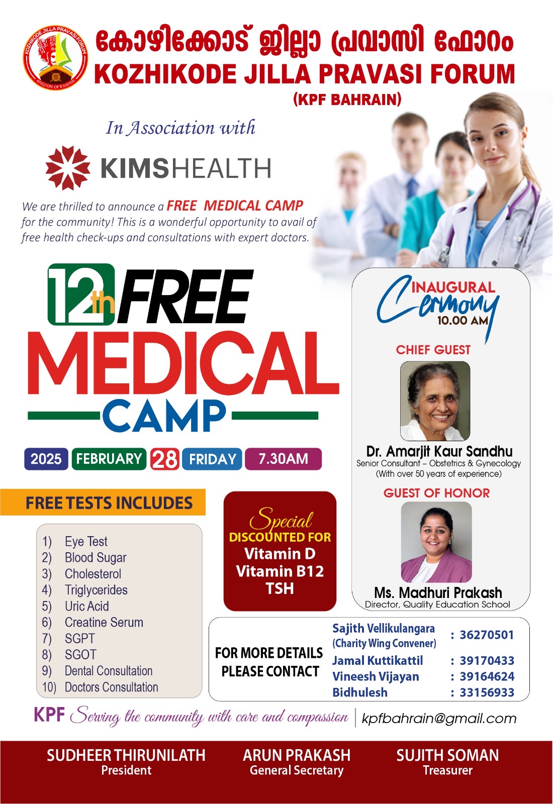 മനാമ: കോഴിക്കോട് ജില്ലാ പ്രവാസി ഫോറം (കെ.പി.എഫ്) 2025 ഫെബ്രുവരി 28ന് വെള്ളിയാഴ്ച, ഉമ്മുൽ ഹസ്സത്തെ കിംസ് ഹെൽത്ത് ഹോസ്പിറ്റലിൽ രാവിലെ 7:30 മുതൽ ഉച്ചയ്ക്ക് 12:00 വരെ മെഗാ മെഡിക്കൽ ക്യാമ്പ് സംഘടിപ്പിക്കുന്നു. 500-ലധികം പേർ പ്രസ്തുത ക്യാമ്പിൽ പങ്കെടുക്കുമെന്ന് പ്രതീക്ഷിക്കുന്നതായി ഭാരവാഹികൾ അറിയിച്ചു.