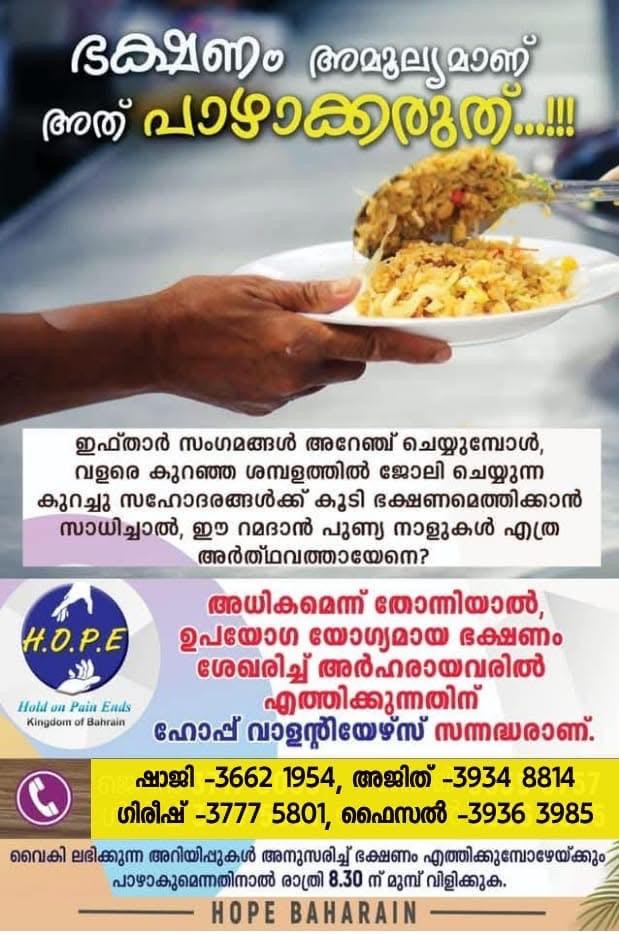 റമദാന് വ്രതാനുഷ്ടാന നാളുകളില് ബഹ്റൈനിലെ വിവിധ ഇഫ്ത്താര് സംഗമങ്ങളിലും കുടുംബങ്ങളിലും ഭക്ഷണം അറേഞ്ച് ചെയ്യുമ്പോൾ, വളരെ കുറഞ്ഞ ശമ്പളത്തിൽ ജോലി ചെയ്യുന്ന കുറച്ച് തൊഴിലാളി സഹോദരങ്ങൾക്ക് കൂടി ഭക്ഷണമെത്തിക്കാൻ സാധിക്കുമെങ്കിൽ നിങ്ങളെ സഹായിക്കാൻ ഹോപ്പിന്റെ പ്രവർത്തകർ തയ്യാറാണ്. അധികമെന്ന് തോന്നിയാൽ, ഉപയോഗിക്കാൻ കഴിയുന്ന ഭക്ഷണം ശേഖരിച്ച് അര്ഹരായ ആളുകള്ക്ക് എത്തിക്കാനും ഹോപ്പ് അംഗങ്ങൾ സന്നദ്ധരാണ്.