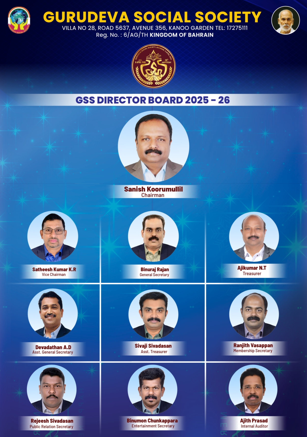 മനാമ: സൽമാനിയ കാനു ഗാർഡനിൽ പ്രവർത്തിക്കുന്ന ഗുരുദേവ സോഷ്യൽ സൊസൈറ്റിയുടെ 2025-2026 വർഷത്തെ ഭരണസമിതി നിലവിൽ വന്നു. കഴിഞ്ഞദിവസം സൊസൈറ്റിയിൽ വച്ച് നടന്ന വാർഷിക പൊതുയോഗത്തിൽ മുഖ്യ വരണാധികാരി കൂടി ആയ കുടുംബാംഗം അനിൽ. പി യുടെ സാന്നിധ്യത്തിൽ ഗുരുദേവ സോഷ്യൽ സൊസൈറ്റിയുടെ നിലവിലെ ഭരണസമിതി അടുത്ത രണ്ട് വർഷത്തേക്ക് കൂടി (2025-2026) തുടരാൻ തീരുമാനിച്ചു.