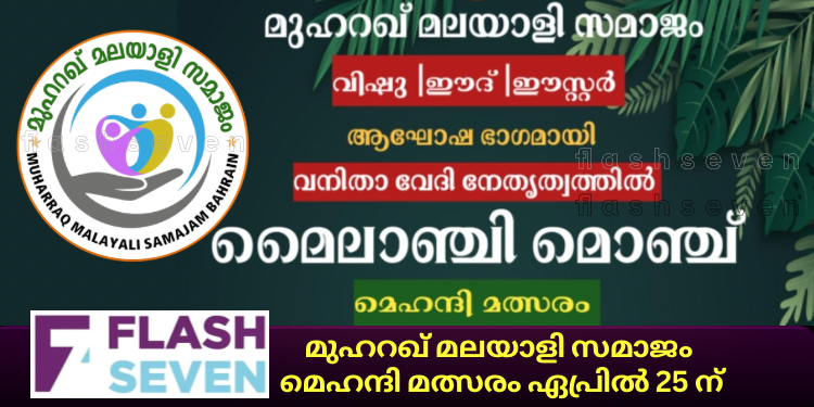 മുഹറഖ് മലയാളി സമാജം വിഷു ഈദ് ഈസ്റ്റർ ആഘോഷ ഭാഗമായി നടത്തുന്ന മൈലാഞ്ചി മൊഞ്ച് സീസൺ 4 മെഹന്ദി മത്സരം ഏപ്രിൽ 25 വെള്ളിയാഴ്ച വൈകിട്ട് 5 മണിക്ക് മുഹറഖ് സയ്യാനി ഹാളിൽ വെച്ച് നടക്കും, എം എം എസ് വനിതാ വേദി നേതൃത്വത്തിൽ എല്ലാ വർഷവും നടത്തി വരുന്ന മത്സരമാണ് ഇത്, മത്സരത്തിൽ പങ്കെടുക്കാനും രജിസ്റ്റർ ചെയ്യാനും കൂടുതൽ വിവരങ്ങൾക്കും ഈ നമ്പരുകളിൽ വിളിക്കണമെന്ന് വനിതാ വേദി കൺവീനർ ഷൈനി മുജീബ്, ജോ. കൺവീനർമാരായ സൗമ്യശ്രീകുമാർ, ഷീന നൗസൽ എന്നിവർ അറിയിച്ചു. 38737381,36565886,39382484